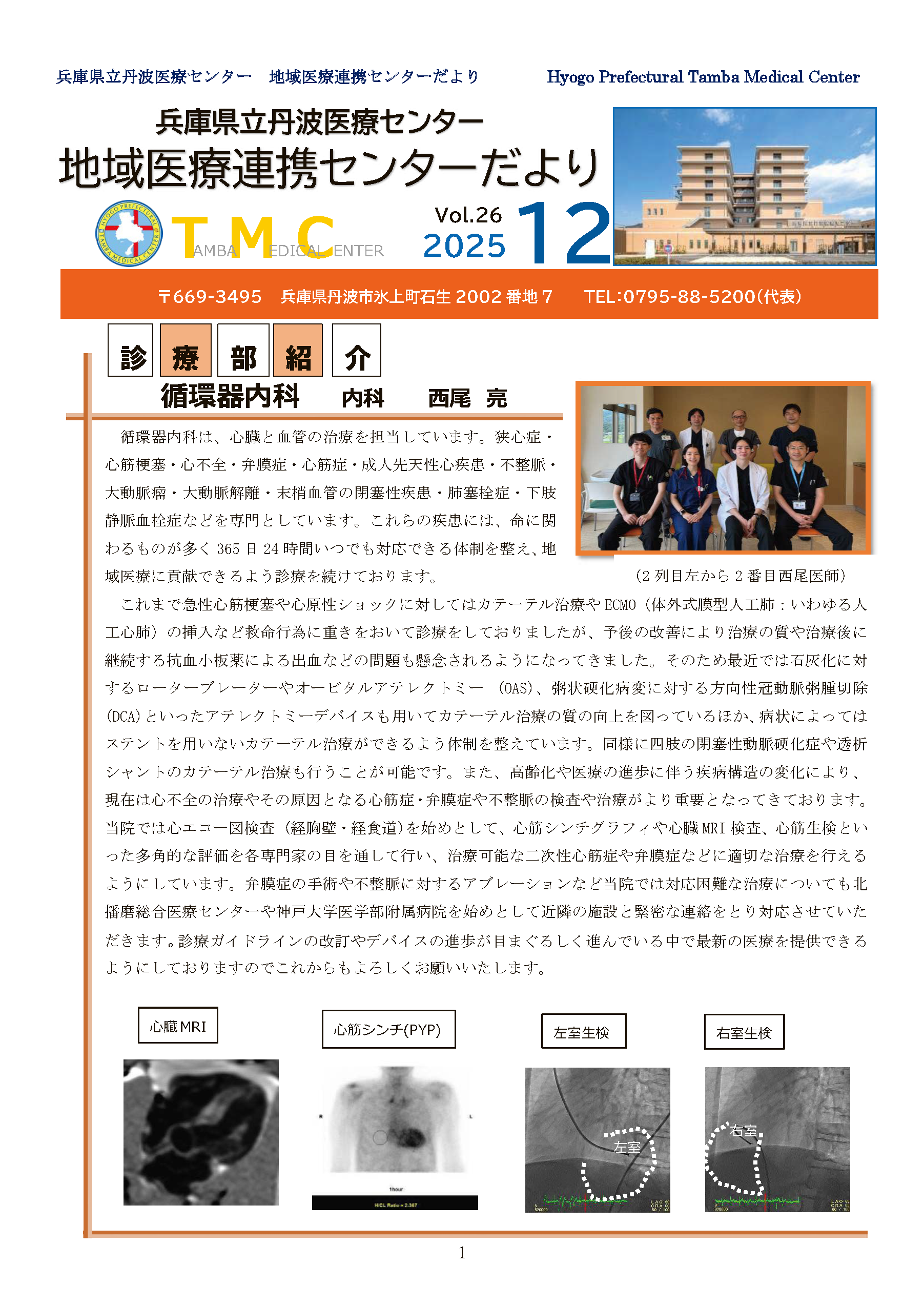 地域医療連携センターでは、「地域医療連携センターだより」を発⾏し、院内の各部⾨・診療科の紹介や活動、最新の医療情報を関連機関や丹波市内全⼾に発信しています。